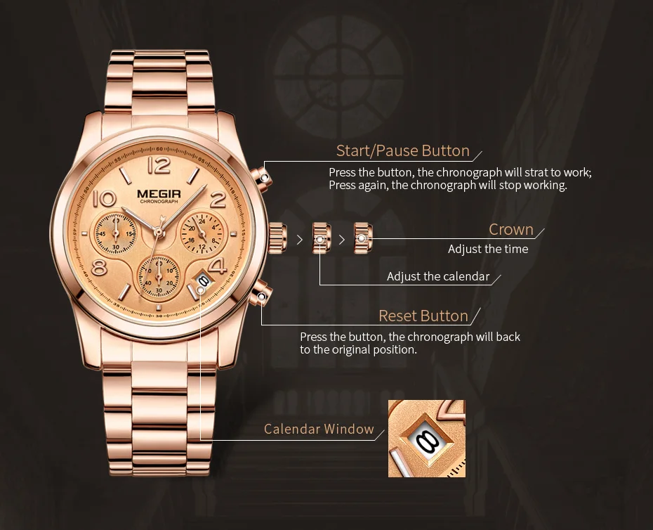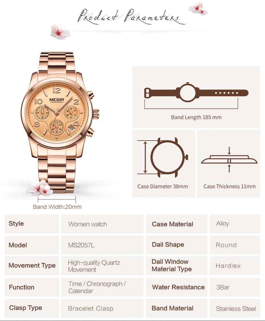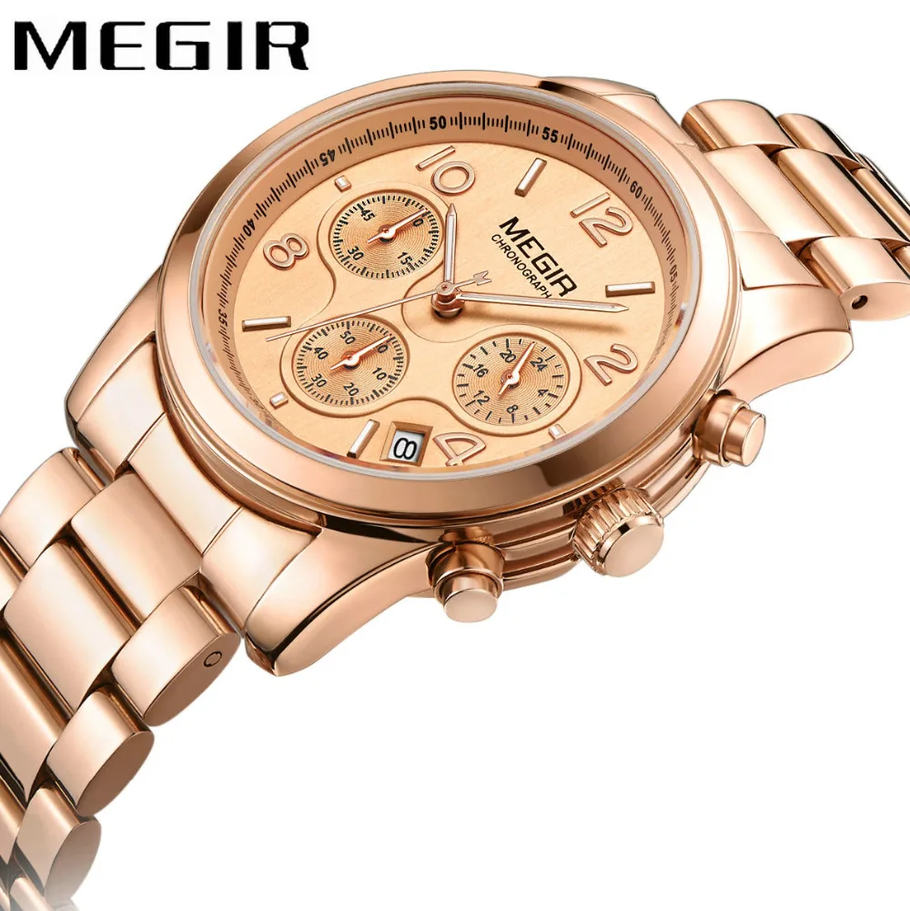 MEGIR Top Brand Luxury Women Watches Quartz Rose Golden Stainless Steel Strap 3D Number Index Calen