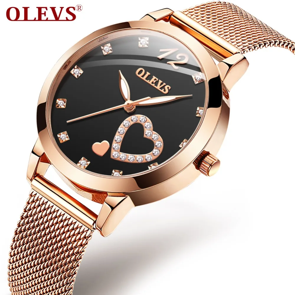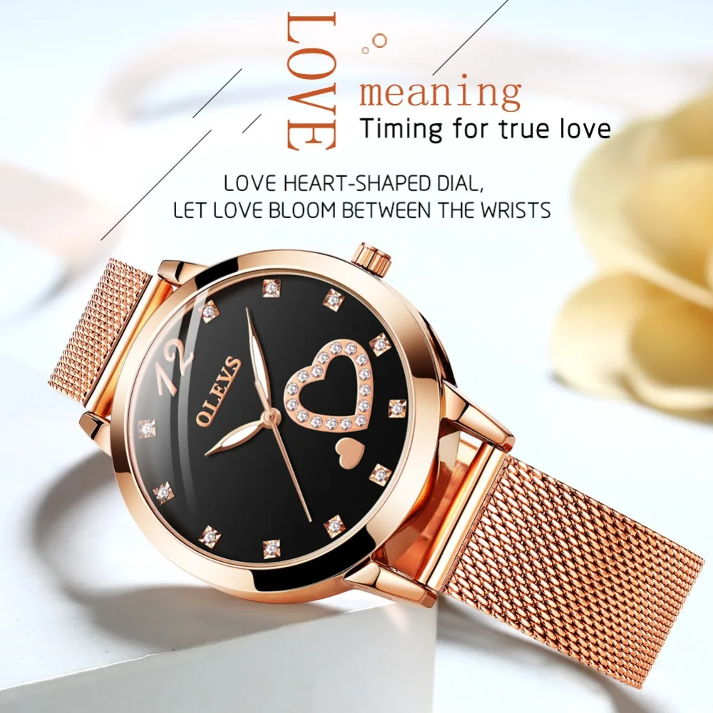 BEST OLEVS Rose Gold Watch Women Heart-shaped Black Ladies Top Brand Crystal Luxury luminous Wrist Watch